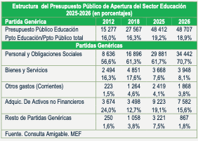 Aumentar los los gastos en Personal y Obligaciones Sociales ha sido a costa de la caída de asignaciones para el resto de partidas presupuestales; por tanto, a costa de otros factores que definen la calidad del servicio educativo. Entre el 2012 y 2026 los Bienes y Servicios aumentaron sus recursos en S/ 1 454 millones, pero su participación se redujo en el presupuesto en 50%. Además, comparadas las asignaciones de los años 2018 y 2026 se aprecia una reducción de S/ 2,4 millones en las partidas para Bienes y de S/ 901 millones para Servicios, lo que explica la insuficiencia y poca eficacia de las acciones de capacitación, monitoreo y apoyo técnico a las instituciones de enseñanza.