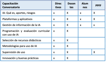 El desarrollo de capacidades de manejo de la IA no debe limitarse solo al personal directivo y docente sino también a estudiantes y padres, debiendo abarcar temáticas como las referidas a los temas siguientes: (i) los beneficios del buen uso, moderación de su empleo, supervisión y transparencia; (ii) los riesgos que hay que enfrentar; y (iii) el fomento de la innovación, creatividad e intercambio de buenas prácticas.