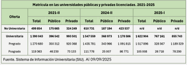 Según la información de la SUNEDU, en los centros de educación universitaria se están atendiendo 1 622 904 estudiantes lo que representa 2/3 de la matrícula total de educación superior. En el Pregrado asiste el 93,5% del alumnado. La universidad privada asume el 78% de la matrícula y el 75% del Posgrado. Comparadas estas cifras con el año 2021-II Semestre, se observa un progresivo descenso del Pregrado y Posgrado público, más acentuado en el Posgrado.