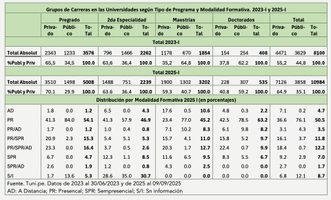 Oferta según modalidades de atención. Al 30/06/2023 las universidades ofrecían 8 100 programas, cifra que se ha incrementado 35,6% en el 2025. En su composición se aprecian lo siguiente:
