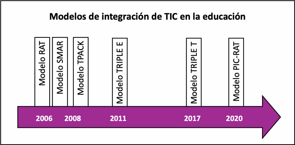 Para ayudarnos en su integración efectiva, hago memoria cronológica de diferentes modelos teóricos y comparto un paisaje con seis modelos que plantean criterios para guiar las decisiones pedagógicas en materia de TIC: