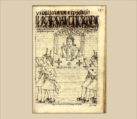 La sociedad incaica fue concebida por los cronistas como la europea, con estratificaciones: una nobleza y una población avasallada bajo formas señoriales. El consejo del Ynga: Inkap rantin qhapaq apu, el gran señor que reemplaza al Ynga. Dibujo realizado por Felipe Guamán Poma de Ayala, "Nueva Corónica y buen gobierno" fol. 342.