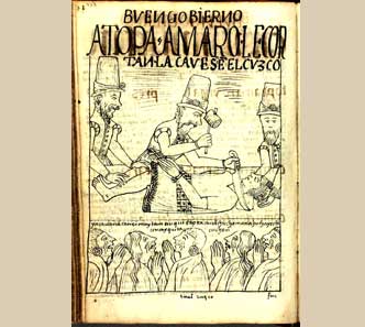 Le cortan la cabeza a Topa Amaro Ynga por orden del virrey Toledo y los nobles incaicos expresan su angustia por la muerte de su rey inocente. Dibujo de Guaman Poma, s. XVII.