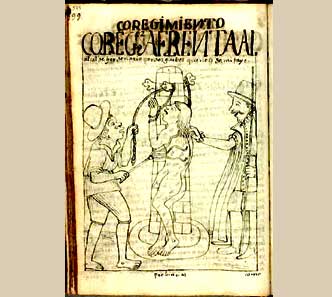 El corregidor ordena a un esclavo africano castigar al alcalde ordinario porque faltan dos huevos en el tributo. Dibujo de Guaman Poma, s. XVII.